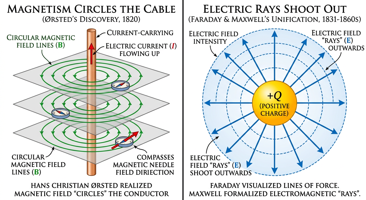 | Click here for the relationships in the use of its language: How volts of difference in charge between two points on a closed circuit divided by ohms of resistance produces amps of current and watts of power (by using coulombs of excess electrons/protons to specify joules of energy per second). 1820 | Realization (pictorially) there was a magnetic field circling the wire whenever a current was present, forming an EM wave.